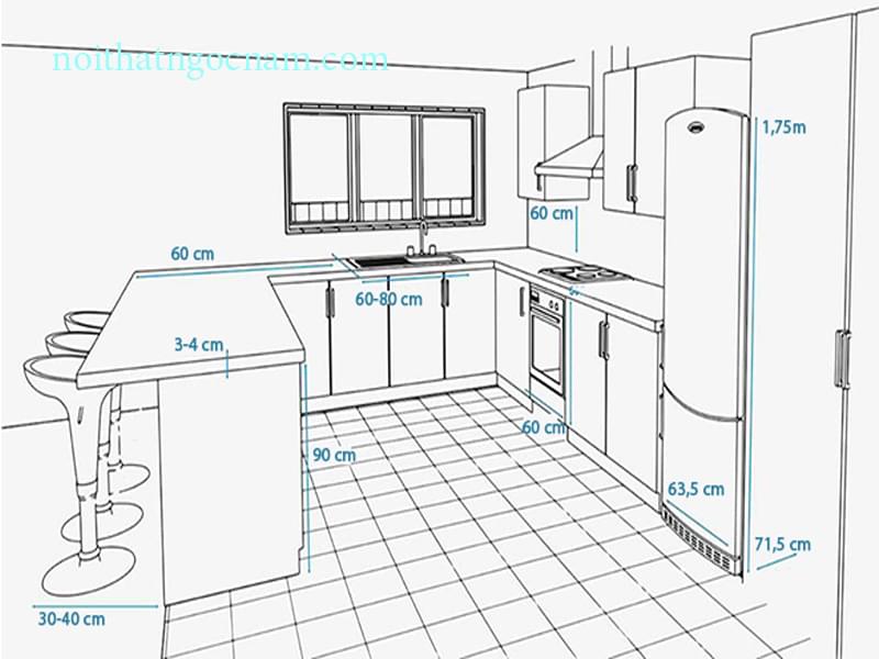 Chiều cao tủ đồ, đảo bếp, khoảng cách giữa chậu rửa và bếp cần tuân theo các quy định chuẩn mực. Tuy nhiên, tùy thuộc vào chiều cao của người thao tác chính trong nhà, bạn có thể điều chỉnh một chút để không phải với tay lên quá cao khi lấy bát đĩa hay bị vướng víu khi hai người cùng nấu bếp. Bạn có thể tham khảo thêm bài viết Kích thước tiêu chuẩn tủ bếp