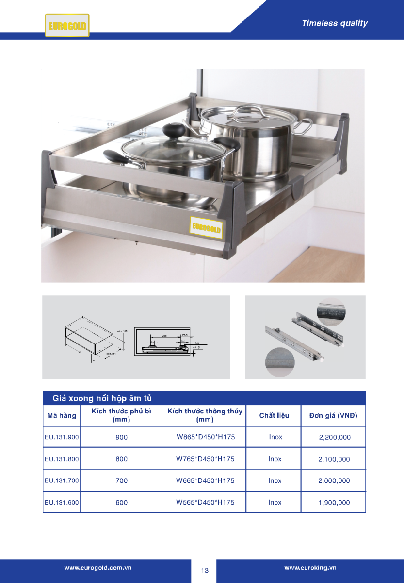 Giá xong nồi hộp âm tủ được thiết kế hoạt động hoàn toàn cơ học, đây là sản phẩm phụ kiện tủ bếp cao cấp của eurogold được sản xuất trên công nghệ tiên tiến nhất. Có nhiều ưu điểm vượt trội phù hợp với người việt, được phân phối độc quyền tại Việt Nam qua các cửa hàng và đại lý chính hãng.