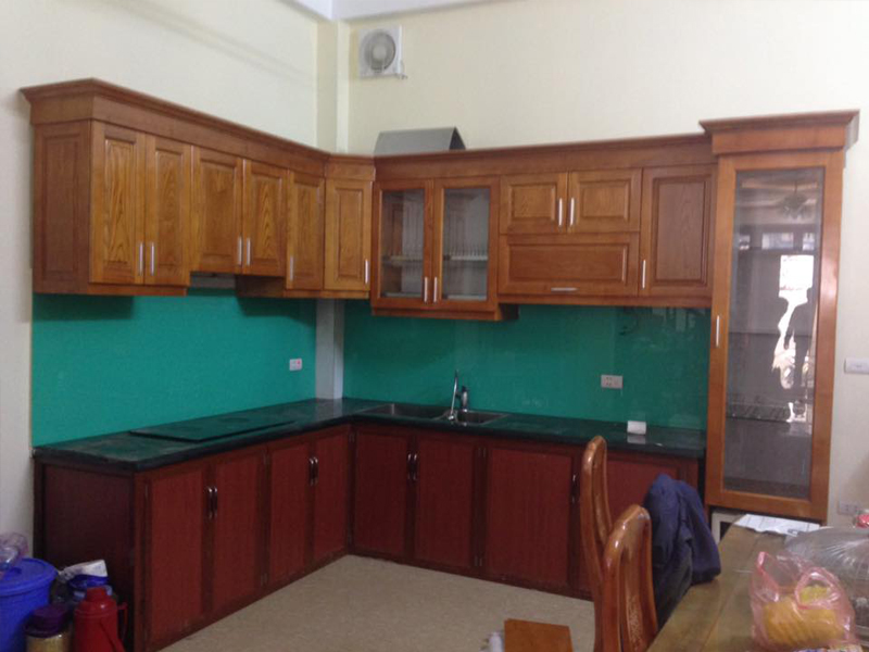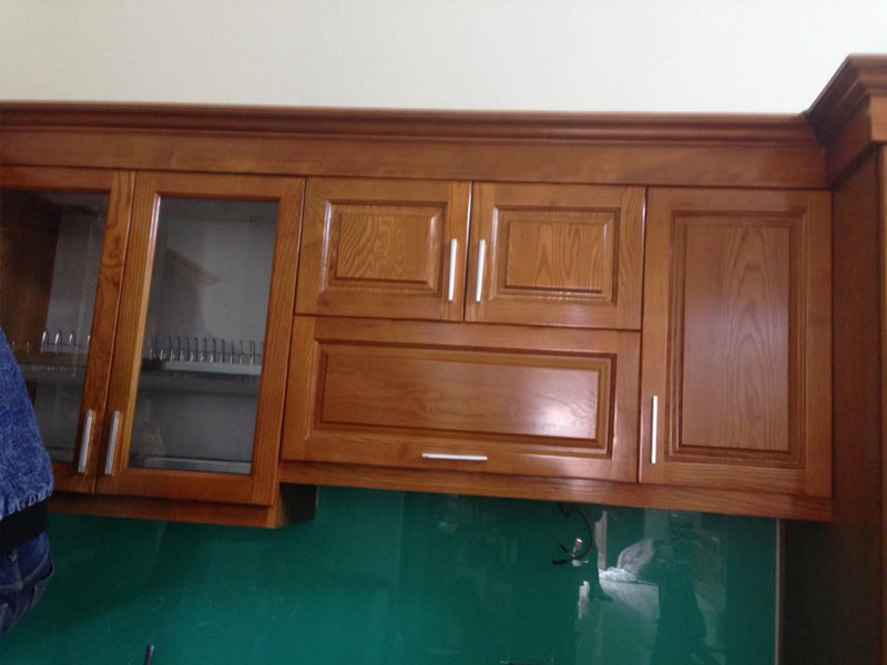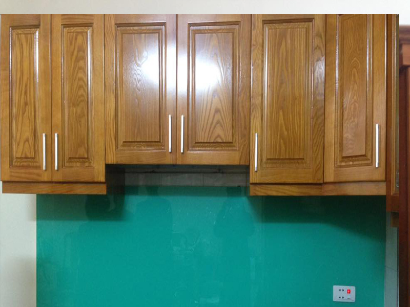 Với nhu cầu hoàn thiện tủ bếp trên bằng gỗ sồi nga tự nhiên sơn màu cánh dán nhạt. nội thất ngọc nam đã tiến hành thiết kế thi công lắp đặt tủ bếp gỗ sồi nga hình chữ L tại Cổ Nhuế - HN