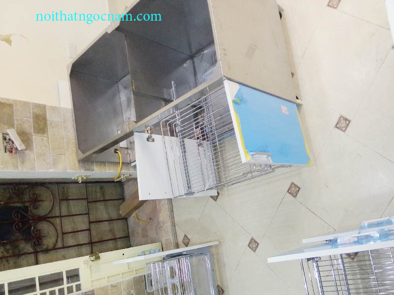 Tủ bếp inox đang được lắp tại phòng bếp gia đình ở Thái Bình