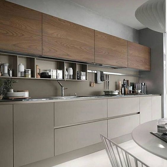 Ngoài ra để hài hòa bạn có thể kết hợp các chất liệu laminate vân gỗ và chất liệu acrylic sang bóng trong một bộ tủ bếp nhà bạn một cách khéo leo, tinh tế nhất.