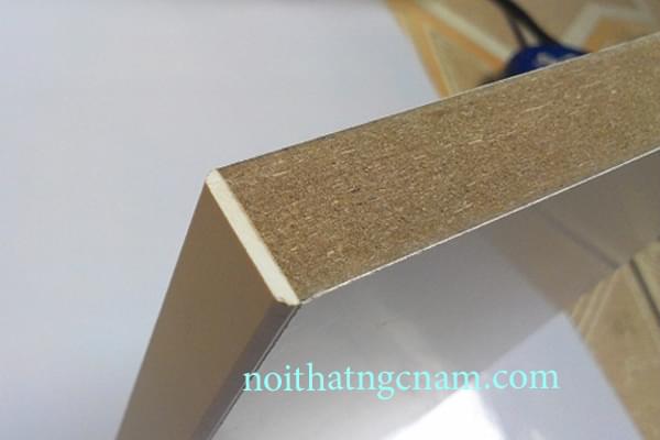 Nhìn về hình thức bên ngoài thật mà khó phân biệt được đâu là vật liệu Laminate đâu là vật liệu Melamine. Bí quyết để biết đơn vị đóng tủ bếp đã làm loại vật liệu gì thì bạn có thể kiểm tra độ dày của vật liệu dán bề mặt (bởi Laminate có độ dày còn Melamin rất mỏng) thông qua tất cả vị trí hở gỗ như; vị trí khoan để bắt bản lề, tay nắm tủ, ống lắp máy hút mùi hay phía dưới chân tủ đây là vị trí mà thường sẽ hở