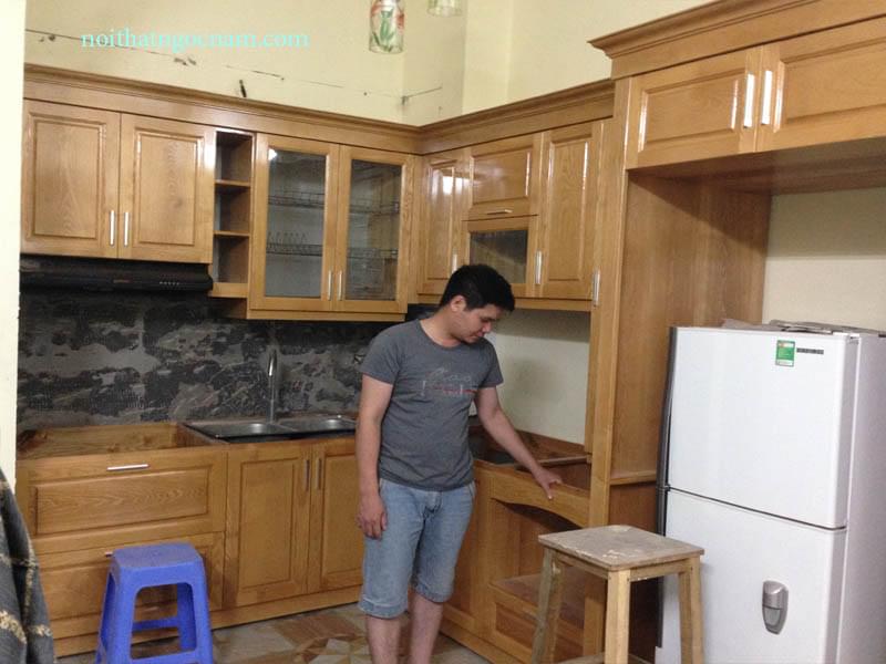Chị Thu nhà tại Ngọc Thụy - Long Biên - Hà Nội. Sau khi xây nhà do không có nhiều điều kiện chị đã làm tủ bếp nhôm kính cho phòng bếp, nhưng sau một thời gian sự dụng thấy sự bất tiện cũng như độ thẩm mỹ của tủ bếp nhôm kính. Qua tim hiểu về các mẫu tủ bếp hiện có trên thị trường chị đã quyết định thiết kế đóng mẫu tủ bếp gỗ sồi Nga.