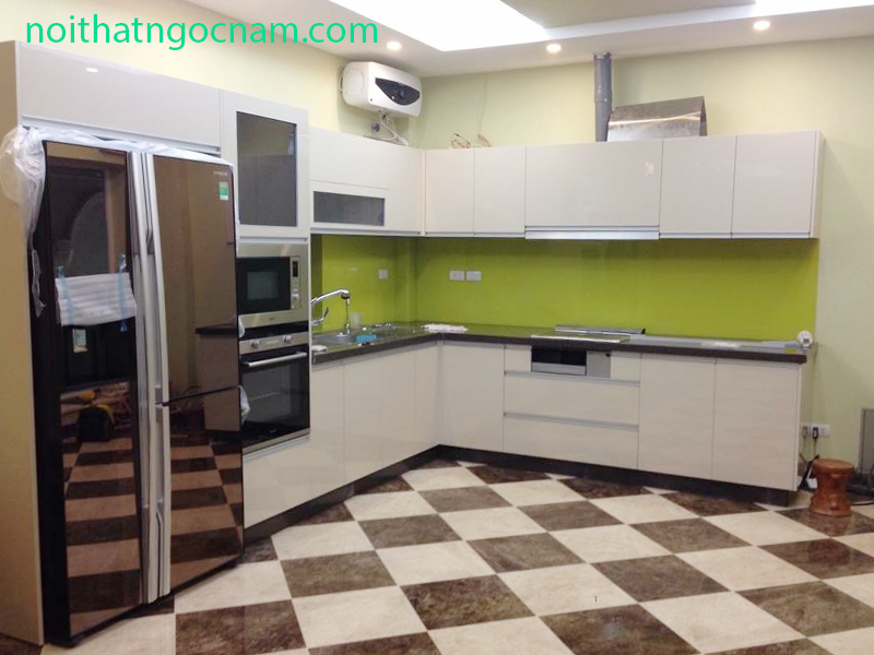 Tủ bếp gỗ công nghiệp cánh Acrylic giá là: 5.500.000/ 1 mét dài (mẫu tủ bếp sử dụng ván gỗ công nghiệp lõi xanh chống ẩm là MDF hoặc MFC làm thùng tủ)