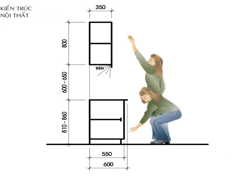 - Chiều cao tủ bếp dưới là 81cm - 85cm đã bao gồm cả độ dày của mặt đá là 1,8cm. Chiều sâu tủ bếp dưới là 58cm khổ mặt đá sẽ là 61cm.