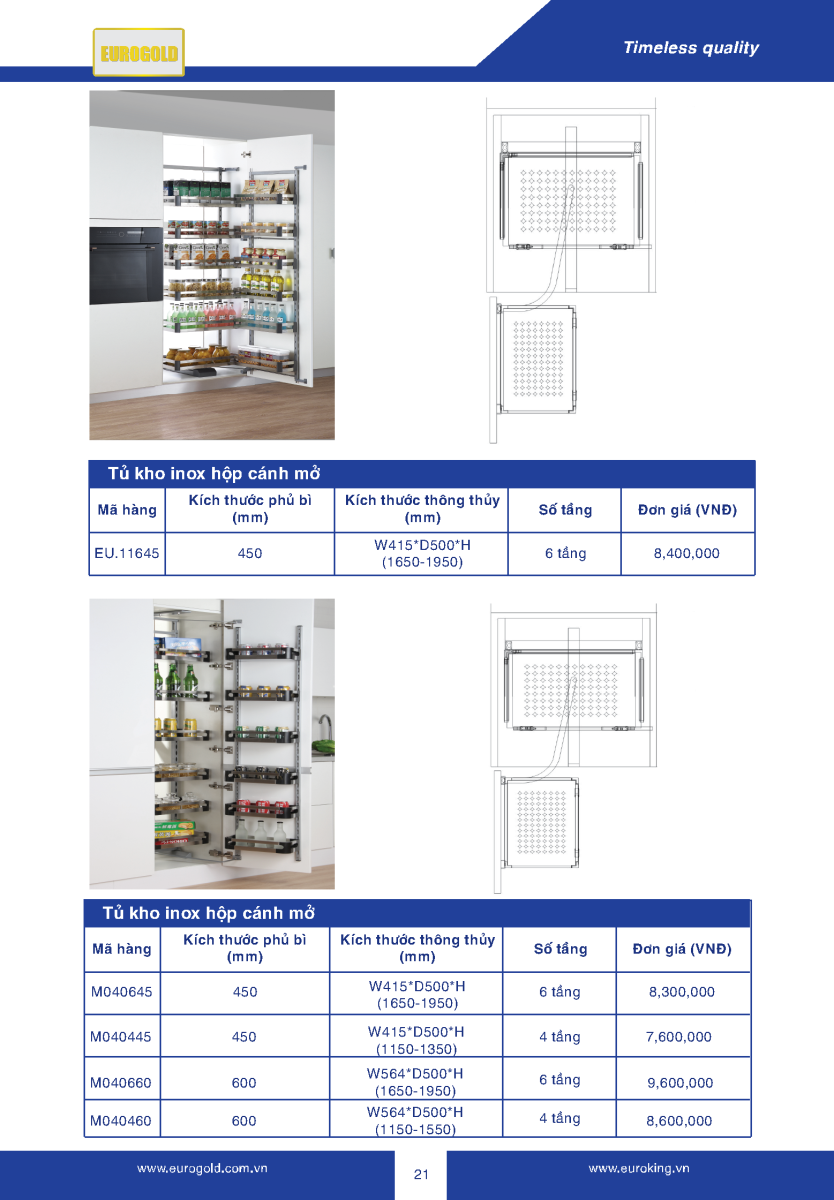 Tủ kho inox cánh hộp được thiết kế hoạt động hoàn toàn cơ học, đây là sản phẩm phụ kiện tủ bếp cao cấp của eurogold được sản xuất trên công nghệ tiên tiến nhất. Có nhiều ưu điểm vượt trội phù hợp với người việt, được phân phối độc quyền tại Việt Nam qua các cửa hàng và đại lý chính hãng.