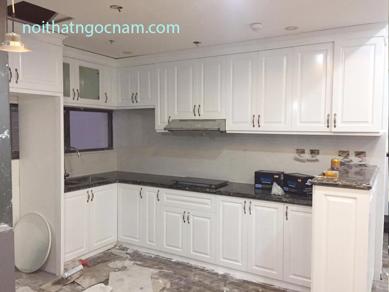 Mẫu tủ bếp xoan ta sơn trắng đăng hoàn thiện tại nhà dân
